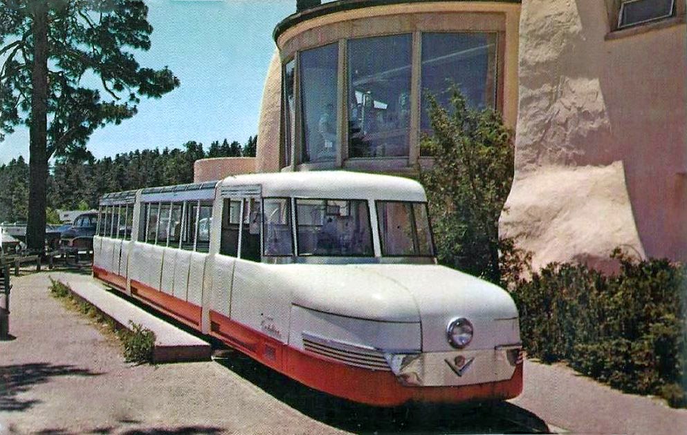 In the 1950’s, Cadillac built a modern custom engine just for this ride.    This engine has been refurbished and is on display on in the parking lot of the Cheyenne Mountain Zoo. This display track is a piece of track in its original location.   Remnants of one of the four tunnels and the railroad bed near the water tank just below the zoo are still visible.