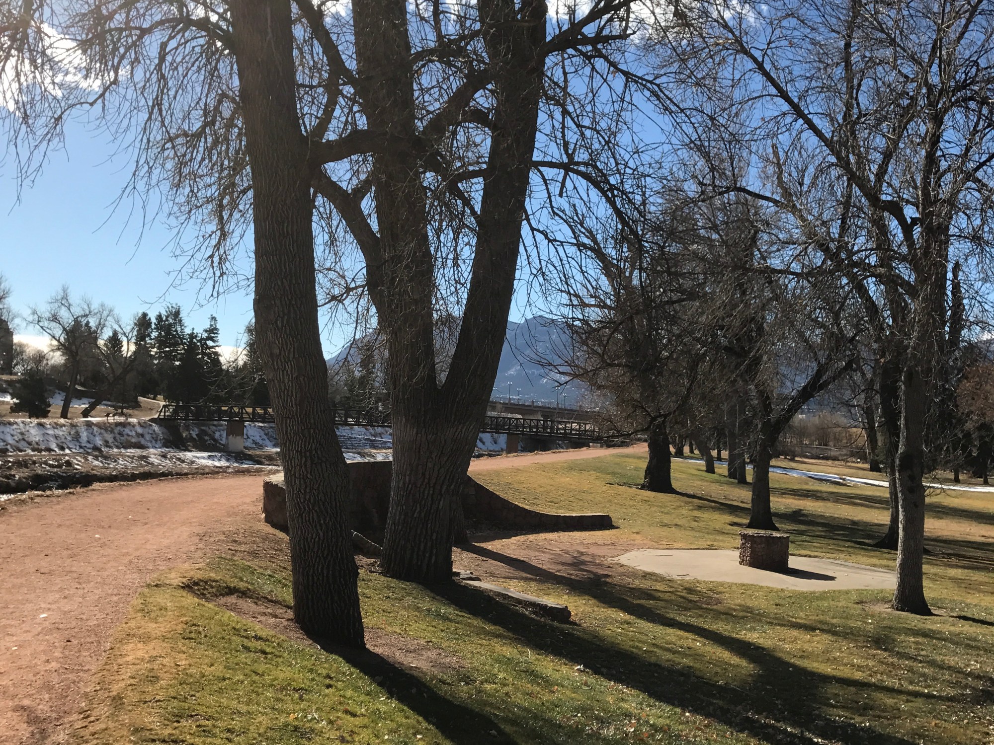 When General Palmer decided to make Colorado Springs a draw for the east coast tourists, the location pretty much had the geophysical attractiveness of the high prairie we see east of town. After a few decades of progress, this part of town was unattractive and made a very poor first impression. The tourists would be arriving by train from a connection in Denver, so he built this park filled with beautiful trees, landscaping and small structures to dress up the last couple of miles of their travels into town. What an oasis in the high prairie!