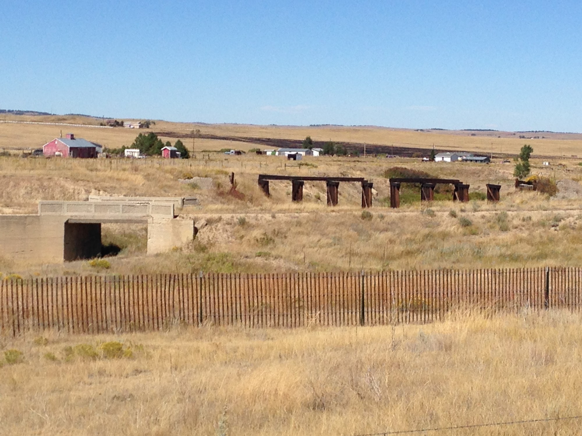 This melancholy view says so much about this historic route.  In the foreground is the long abandoned concrete bridge of the Ocean to Ocean Highway that ended in New York.  Running parallel to the road are the remains of the wooden railroad bridge that terminated in Chicago.  These historic bridges are easily seen from Highway 24 east of Calhan.