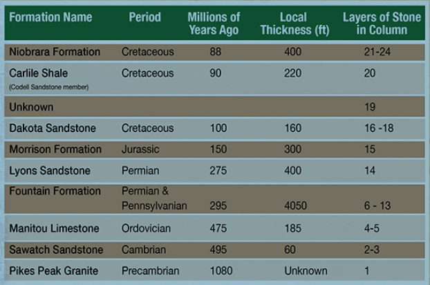 These natural layers may be easily seen in the parking lot of Red Rock Canyon Open Space or in the roadside cuts driving up Highway 24 above Manitou Springs.