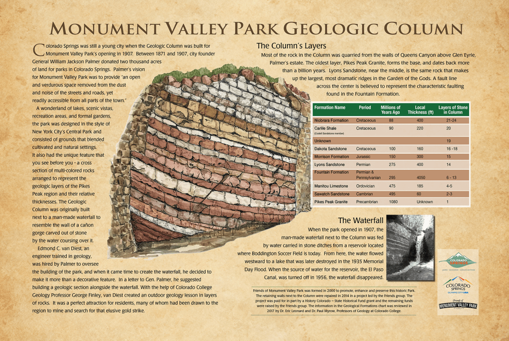 Colorado Springs’ founder, General William Palmer, initiated this creative way to display the fascinating cross-section of layers under our feet after receiving the idea in a letter from his engineer, Edwin C. van Diest.