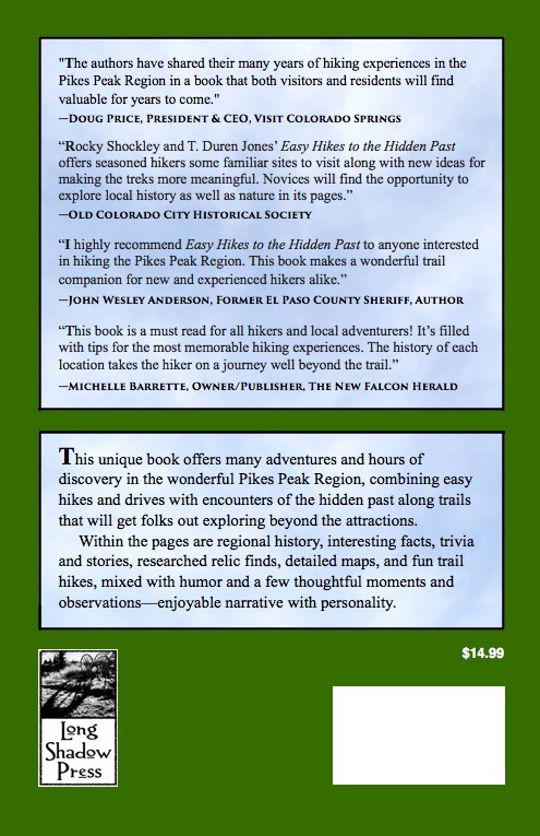 Rocky Shockley and T. Duren Jones’ Easy Hikes to the Hidden Past offers seasoned hikers some familiar sites to visit along with new ideas for making the treks more meaningful. Novices will find the opportunity to explore local history as well as nature in its pages. OLD COLORADO CITY HISTORICAL SOCIETY